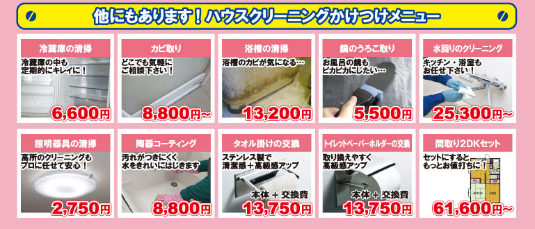 サービスメニュー 水まわり 内装 電気まわり 外まわり ハウスクリーニング お手伝い 不用品整理